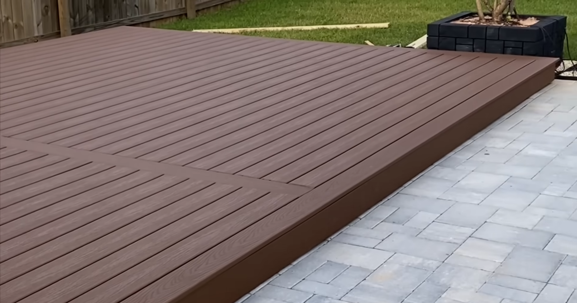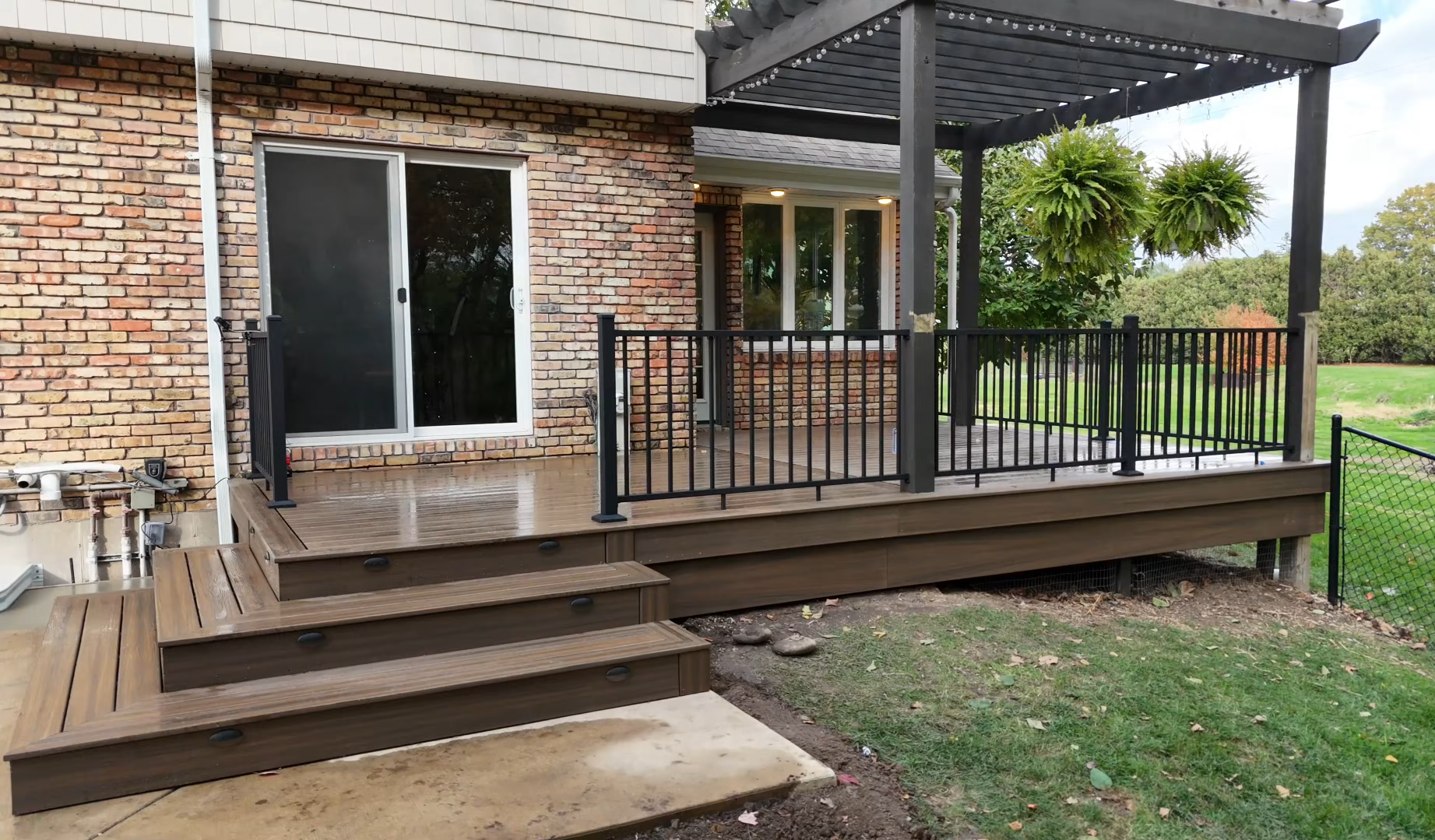 • Newly built wooden deck with three steps, black railing, and hanging plants outside a brick house with large window and sliding door.